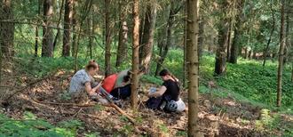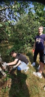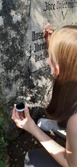 Angespornt durch das Gehörte, trafen wir uns am nächsten Tag auf historischem Grund. In mehrere Interessenteams aufgeteilt, ausgerüstet mit allen benötigten Arbeitsmaterialien, Mappen mit Plänen, Fotos, Protokollen, Dokumenten und Tagesberichten, hierzu fachlich eingewiesen und angeleitet in die jeweiligen Aktivitäten gingen die Jugendlichen voller Elan an die Arbeit. Dazu gehörte unter anderem die Suche nach Artefakten in ehemaligen Lagern, ihre Restaurierung und Hintergrundrecherche, da alle eine persönliche Geschichte erzählen. Das Vermessen und Kartographieren von Bauresten auf vorbereiteten Unterlagen, wie auch das Freilegen, Reinigen und Restaurieren von Gedenksteinen sowie die dokumentarische Begleitung aller Projektarbeiten. An diesem Tag haben wir Jugendliche erlebt, die sich voller Elan engagierten.