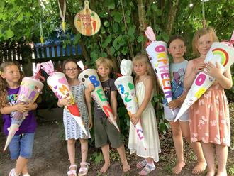 Wir sagen Danke an unsere Elternbeiratsvorsitzende Frau Sophie Ludwig, die dafür gesorgt hat, dass in diesem Jahr besonders schöne Zuckertüten gewachsen sind. Wir danken Frau Franziska Trutschel dafür, dass die Zuckertüten rechtzeitig reif am Baum hingen. Familie Ali von Azad 21 bereicherte unser Fest mit superleckerer Pizza, die unsere beiden Elternbeiratsmitglieder servierten. Wir danken Frau Andrea Stangenberg für die liebevollen persönlichen Briefe an die Vorschulkinder. Der traurige Abschied wurde zu einem unvergesslichen Höhepunkt für die Kinder, das Team, die Eltern und unsere Kooperationspartner. Wir wünschen unseren Kindern eine wunderbare Schulzeit.