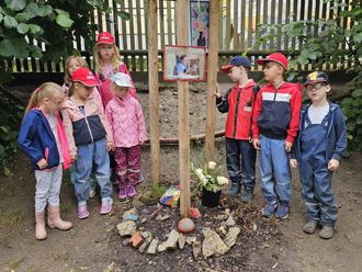 Ganz herzlich bedankt haben sich die Kinder und deren Eltern bei ihrer geliebten, 2021 verstorbenen Erzieherin Heike Umbreit. An ihrem Erinnerungsbaum dachten sie ganz fest an sie und legten dort Blumen ab. Sie werden ihre liebevolle Wegbegleiterin nie vergessen.