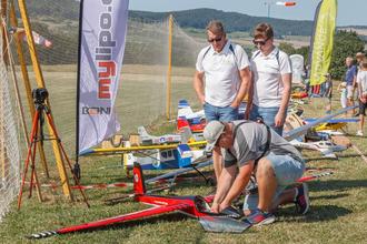 Den ganzen Tag lang im 15 Minutentakt präsentierten die Piloten ihre Modelle und ihr Können. Hubschrauber und Motorflieger waren im Flug zu bestaunen. Oben im Bild hinten Familie Vollrath, treue Vereinsmitglieder aus Rudolstadt und unser Hauptpilot Michael Gerber, hier mit seinem 3.3m großen Motorsegler „Swift - S1“.