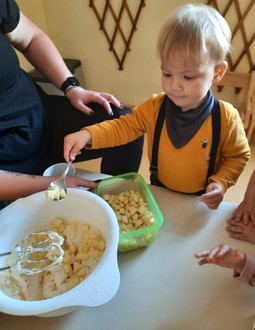 Die Zutaten für die vielen Leckereien brachten die Kinder mit. Sie kamen mit kleinen Beuteln und zeigten stolz, was sie zu den Backwaren beitragen möchten. Schon früh am Morgen heizte unser Hausmeister Christian im Lehmbackofen ein. Die Kinder konnten es kaum erwarten, dass endlich das Frühstück vorbei ist und das Backen beginnen kann. Gemeinsam haben sie die Zutaten abgemessen, in die Rührschüsseln gegeben und alles vermengt. Genascht wurde natürlich auch. Im ganzen Haus hörte man Schneebesen schlagen und Mixer rühren, es zog ein verlockender Duft durch die Räume.