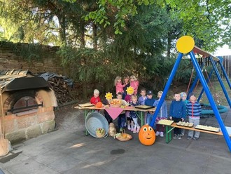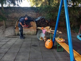 Pünktlich um 09:15 Uhr trafen sich alle Kinder und Pädagogen mit ihren Blechen am Lehmbackofen im Garten. Die Kinder staunten, als sie die Glut im Ofen sahen. Alle zusammen begrüßten die neue Jahreszeit mit dem Lied: „Der Herbst ist da.“ Unsere Leiterin zeigte in einem bunten Körbchen einige Erntegaben, die die Kinder natürlich sofort erkannten. Dann wurde es spannend, denn unser Hausmeister Christian schob den ersten Kuchen in den Ofen. Die Wartezeit überbrückten die Kinder mit Bewegung im Garten und vertieften sich in ihr Spiel. So hatten die Kuchen gleich noch Zeit auszukühlen.