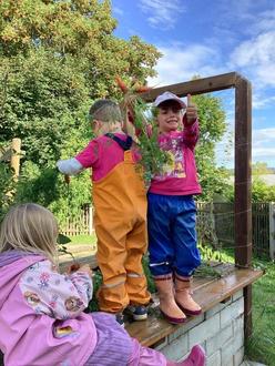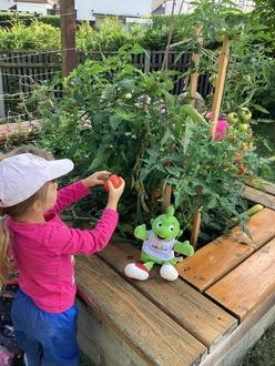 Nun ist es Zeit für die Ernte und das Genießen. Aus den Tomaten, Möhren und Gurken zaubern die Kinder mit den Fachkräften nun täglich gesunde Gerichte. Wir hoffen, dass das Wetter mitspielt und wir noch viel reifes Gemüse ernten können.