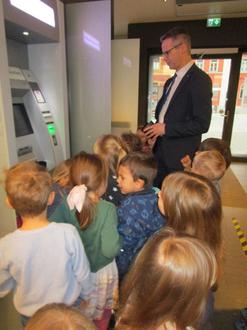 An diesem Tag wurden sie freundlich von den Mitarbeitern der Volksbank Kahla begrüßt und in einen großen Raum begleitet. Dort erfuhren sie, wie die Banken entstanden sind und was man dort alles machen kann. Gemeinsam sahen sie wie an einem Geldautomaten Geld ein- und ausgezahlt werden kann. Viel Spaß hatten die Kinder beim Geld zählen mit der Zählmaschine. Doch es wurde noch aufregender, als sie mit ihrer Geheimzahl einen Schlüssel erhielten und mit den Mitarbeitern der Volksbank eine Treppe tiefer gingen. Dort standen sie vor einer großen Tresortür und hinter der sich viele Schließfächer der Bankkunden befanden. Mit Hilfe ihrer Geheimzahl fanden sie ein Schließfach in dem ein Schatz auf sie wartete.