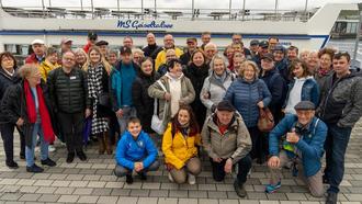 Das Foto zeigt die Gruppe beim Ausflug vor dem Boot am Geiseltalsee