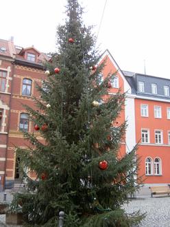 2012 schmückte nochmals ein Weihnachtsbaum aus dem Vereinsgelände der Kahlaer Sportangler unseren Marktplatz zur Weihnachtszeit. Es war die letzte Möglichkeit um ein Weihnachten ohne Weihnachtsbaum auf dem Markt zu erleben.