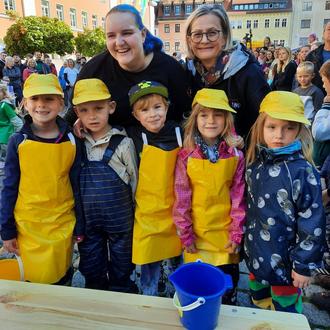 Doch auch für unsere Löwengruppe stellte das Fest ein Highlight da. Sie übten bereits seit Wochen eifrig für den kleinen Wasserlauf der Kindergärten. Begeistert und erwartungsvoll blickten sie oft auf den Pokal, welcher seit dem Sieg im vergangenen Jahr in unserem Eingangsbereich steht. Motiviert und etwas aufgeregt gingen vier mutige Kinder an den Start. Zahlreiche weitere Kinder waren zum Anfeuern ihrer Freude gekommen. Am Ende bewiesen sie wahren Teamgeist und konnten den Wettbewerb souverän für sich entscheiden. Auf der Bühne wurden schließlich die kleinen Wasserläufer aller Kindergärten für ihren Einsatz geehrt und bekamen viel Applaus vom Publikum.
