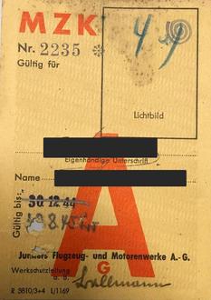 Originaldokument der Junkers Flugzeug- und Motorenwerke A.-G., Werkschutzleitung.