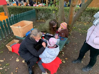 Nach dem Mittagsschlaf gab es verschiedene Angebote in den Gruppen für die Kinder. Sie experimentierten mit Licht, veranstalteten ein Kinderkino, tanzten und sangen zur Musik. Gegen 15.30 Uhr trafen dann die fleißigen Elternvertreter ein, um gemeinsam die Versorgungsstände aufzubauen. Neben Bartwurst und Suppe, gab es auch jede Menge kalte und warme Getränke im Angebot. Weiterhin hatten die Gäste die Möglichkeit auf Schatzsuche im Laub zu gehen, sich Schminken zu lassen oder sich leuchtende Tattoos machen zu lassen. Es konnte gebastelt werden und es gab die Möglichkeit sich sportlich zu betätigen bei einem Lichterparcours.