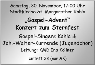 | 17:00 Uhr | Kahla: „Gospel-Advent“ Konzert zum Sternfest |
