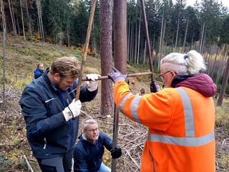 Auf Empfehlung der Revierförsterin Frau Triller wurden Traubeneichen, Baumhasel, Esskastanien und Douglasien gepflanzt - eine Mischung, die nicht nur die Biodiversität stärkt, sondern auch die Widerstandsfähigkeit der Wälder gegenüber Klimaveränderungen erhöht. Eine Teilfläche wurde mit einem Wildschutzzaun versehen, um die jungen Bäume vor Verbiss zu schützen.