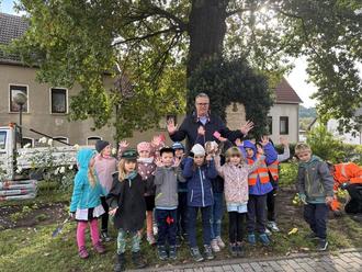 Auch die jüngsten Kahlaer Bürgerinnen und Bürger setzten ein Zeichen für Artenvielfalt: Gemeinsam mit dem Bürgermeister und den Mitarbeitenden des Bauhofs pflanzten rund 30 Kindergartenkinder etwa 300 Wildtulpenknollen am Friedrich-Ebert-Denkmal in der Heimbürgestraße.
