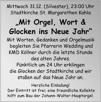 | 23:00 Uhr | Kahla: „Mit Wort, Musik & Glockenklang ins neue Jahr“ | |