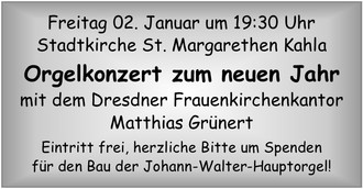 | 19:30 Uhr | Kahla: Orgelkonzert zum neuen Jahr | |