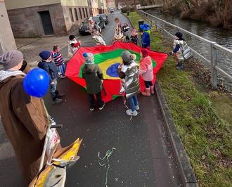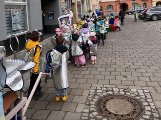 Am Rosenmontag war die Verwunderung der Bewohner unserer schönen Stadt Kahla groß: Lief doch ein ganzer Zug kleiner und großer Ritter mit Konfetti-Katapult und einem gefährlichen grünen Drachen durch unsere Stadt. Das besondere daran war, dass Rüstungen, Helme und Zubehör, ja sogar das Katapult und der Drachen selbst kreiert, gebastelt und gebaut wurden. Das Rosenmontagsthema „Mittelalter“ war der Wunsch unserer Kinder und sie genossen ihren großen Auftritt und die bewundernden Blicke der Passanten sehr. Am Faschingsdienstag feierten wir noch einmal innerhalb unserer Kita mit Disco, Kinderschminken, einem leckeren Buffett und lustigen Spielen.