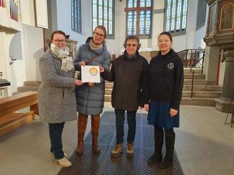 C. Preuß (Gewerbegemeinschaft Kahla) überreicht die Spende an Pfarrerin E. Wedding, M. Hellwig und KMD I. Köllner (Ev. Kirchgemeinde Kahla und Orgel-Förderkreis).