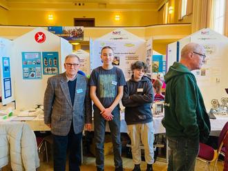 v. l. Betreuer Hans-Chr. Schmidt, Nils Lindner Kl. 9c, Noah Bernhardt, Kl. 7c vor unserem Messestand