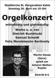| 19:00 Uhr | Kahla: Orgelkonzert mit Martin Hesse (Achtung: geänderte Anfangszeit!) |