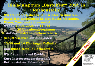 Wir freuen uns, dieses Jahr wieder zu unserem Basteifest einzuladen! Es gibt Musik, Getränke, Essen, Tanz und vieles mehr!