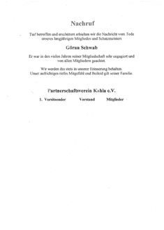 Tief betroffen und erschüttert erhielten wir die Nachricht vom Tode unseres langjährigen Mitgliedes und Schatzmeisters