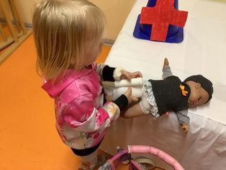 In der Puppenklinik gab es wichtige Informationen zur Unfallverhütung und es wurde besprochen, wie man im Notfall um Hilfe ruft.