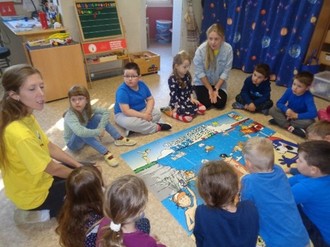 Diesmal waren wir in den frühlingshaften Garten eingeladen. Zur Begrüßung brachten wir zwei schöne Frühlingslieder, eine Schmetterlingsgirlande und ein Blümchen mit. Draußen haben wir gemeinsam mit Schwungtuch und Ball etwas Sport gemacht. Leider hat es zwischendrin geregnet, aber davon haben wir uns die gute Laune nicht nehmen lassen und haben im Haus Schallplatten angehört und Tischspiele gespielt. Zur Stärkung gab es leckeren Saft.