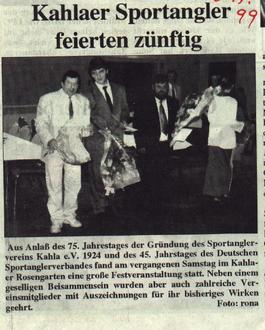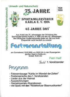 Anlässlich des 75. Jahrestages der Gründung des Sportanglervereins Kahla e.V. 1924 und des 45 Jahrestages der Gründung des Deutschen Anglerverbandes e.V. fanden sich die Sportsfreunde des Sportvereines mit ihren Frauen und Ehren-gäste am Samstag, den 15.05.1999 im Rosengarten zu Kahla zu ihrer Festveranstaltung ein. Zu dieser Veranstaltung konnte der 1. Vorsitzende Sportfreund Udo Gudd zahlreiche Gäste begrüßen, so den Minister des Thüringer Ministeriums für Landwirtschaft, Naturschutz und Umwelt, Herr Volker Sklenar, den Staatssekretär des Thüringer Ministeriums für Wirtschaft und Infrastruktur, Herr Roland Richwien, den Landrat des Saale- Holzland- Kreises, Herr Jürgen Mascher, den Abordnete der CDU des Thüringer Landtages und „Ehrenmitglied des Sportanglerverein Kahla e.V. 1924“, Wolfgang Fiedler, den Sportfreund Kemp, Vizepräsident des Präsidiums des DAV sowie dem Präsidenten des AFOT, Sportfreund Schiller.