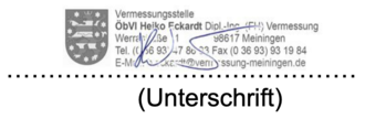 Gegen das Ergebnis der Liegenschaftsvermessung kann innerhalb eines Monats nach Ablauf der Offenlegungsfrist bei ÖbVI Heiko Eckardt Dipl.-Ing. (FH) Werrastraße 11, in 98617 Meiningen schriftlich oder zur Niederschrift Widerspruch erhoben werden.