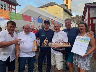 Bernd Arnrich vom Ortsteilrat Fischbach, Horst Hössel vom Schullandheim Fischbach, Jarle Sänger vom Wandermagazin, Uwe Jung als engagierter Wegewart des Hexenpfades, Manuel Andrack vom Wandermagazin und Nadine Arnrich von der VG „Hohe Rhön“ bei der Preisübergabe in Osterspai