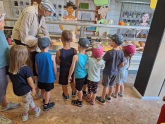 Es begann schon Anfang September. Die „Umpfenzwerge“ folgten der Einladung des Natur Aktiv Museum (NAM) Oepfershausen. Aufgeregt waren die 3- bis 6-Jährigen der Gruppe der „Schlauen Füchse", denn es war eine Premiere, dass sogar die kleinsten Füchse mit zu dem Ausflug durften. Nachdem am Morgen alle mit ihren Kindersitzen kamen, wurden diese auf die Autos der Erzieherinnen und einer Mutti verteilt und los ging die aufregende Fahrt über den Berg nach Oepfershausen. Im NAM wurden sie sehr freundlich von Museumspädagoge Jörg Wagner begrüßt. Gemeinsam ging es auf Entdeckungstour durch den großen Raum. Die Kinder bekamen altersgerecht viel erklärt und stellten sehr viele Fragen. So wurden u.a. ausgegrabene Knochen bewundert und die Bauwerke der Wespen und Hornissen bestaunt. Ertasten und erfühlen konnten die Kinder Gegenstände aus verschiedensten Materialien wie Holz, Stein, Eisen oder Porzellan. Die Kinder probierten sich im Messen und Wiegen aus. So lernten sie Elle und Fußlänge kennen und haben gemessen, wieviel Fußlängen z.B. Käthe misst. Auch das Wiegen war interessant. So wurde Erzieherin Katrin mit einer alten Dezimalwaage und die Kinder mit einer übergroßen Waage mit Pflastersteinen gewogen. Die Sonderausstellung „Wunderbare Welt der Fermentation" wurde durch Jörg Wagner verständlich erklärt und zum Schluss waren die meisten Kinder neugierig auf den angesetzten Kombucha und probierten das Getränk.In der Pause gab es von Christiane selbstgebackene Waffeln und Saft, bevor die Kinder nach ihrer selbstgebauten Sonnenuhr schauten und traurig waren, wie schnell die 2,5 Stunden vergangen sind. Gemeinsam wurde beschlossen, das NAM regelmäßig zu besuchen und die „Umpfenzwerge“ freuen sich schon sehr, wenn das NAM Oepfershausen im Mai wieder seine Pforten öffnet.