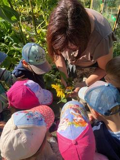 Weiter ging es mit dem Projekt „Sonnenblume". Goldgelb leuchteten die Sonnenblumen in den hübschen Gärten der Kaltenlengsfelder. Mehrmals machten sich die „Umpfenzwerge“ auf den Weg, um die größten Sonnenblumen zu finden. Gemeinsam wurde beobachtet wie die Blumen aufblühen und die Kerne reif und dunkel werden. Es wurden viele Lieder und Gedichte gelernt, tolle Objekte gebastelt, wo auch einmal andere Werkzeuge wie Lupe und Pinzette zum Einsatz kamen und Experimente durchgeführt, bei denen sich z.B. eine Papiersonnenblüte im Wasser öffnet.