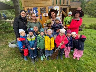 Es wird nicht langweilig bei den „Umpfenzwerge“. Denn am 27. September stand schon der nächste Ausflug vor der Tür: Der Besuch bei der lieben Familie Arnrich im Sommertal in Fischbach. Dort fand das Hexenpfadfest anlässlich des Votings zum drittschönsten Familienwanderweg Deutschlands statt statt und die Kaltenlengsfelder waren, wie die anderen umliegenden Kindergärten auch, eingeladen, mit bemalten Holzschindeln das Spielhaus der Familie Arnrich in ein Hexenhaus zu verwandeln. Im Vorfeld wurden die Umpfenzwerge kreativ. Mit viel Freude, Fleiß und Ausdauer haben sie die Holzschindeln hübsch bemalt, gestempelt oder betupft. Es wurden z.B. die Jahreszeiten, die Umpfenzwerge und sogar die Berghexen auf die Schindeln gebracht. Wieder mit den Autos der Erzieherinnen ging es nach Fischbach, wo Nadine und Bernd schon auf sie warteten. Gemeinsam haben sie die Werke an das Spielhäuschen angebracht und ja: es wurde ein richtiges Hexenhäuschen. Zur Belohnung gab es Kakao, Apfelschorle, Donuts und - wie soll es anders sein - Lebkuchen.Danach erkundeten die Kinder das Sommertal. Es wurden viele Hexen gefunden, ausgiebig getobt und mit den Häschen und den vielen kleinen Katzen gespielt. Danke liebe Familie Arnrich!