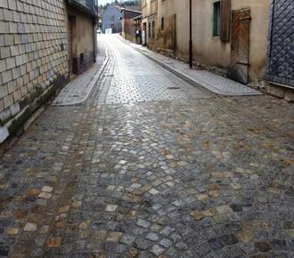 Ab da wurde die Straße mit Großpflastersteinen und die Randbereiche mit Kleinpflastersteinen aus Granit befestigt.