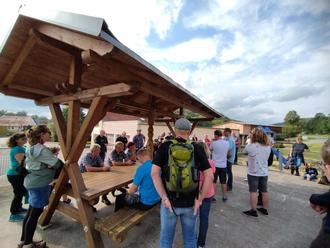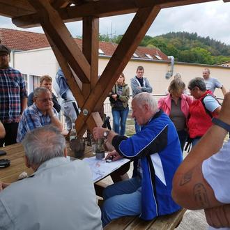 Hierbei scharte er eine Menge Leute an der „Futterraufe“ im Ort um sich, welche gespannt und erstaunt seinen detailreichen Ausführungen lauschten. Allerlei Unterlagen und greifbare Zeugnisse, wie Stücken des vorkommenden Schwerspats oder zwei Grubenlampen rundeten seine Erläuterungen anschaulich ab. Unterstützt wurde er hierbei von Herrn Schönheit.