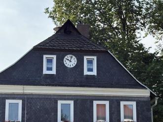 Die Uhr am ehemaligen Schulgebäude im Orsteil Oberschöbling ist wieder in Betrieb. Nach einer Reparatur und der Umstellung auf moderne Digitaltechnik zeigt sie nun zuverlässig die Uhrzeit an - und dazu erklingt tagsüber auch wieder der vertraute Glockenklang.