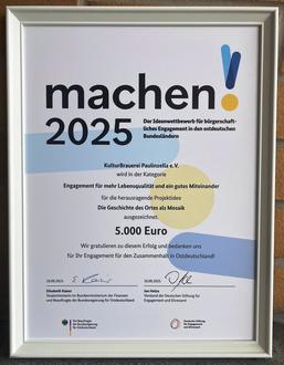 Bei der feierlichen Verleihung des machen!2025-Preises am 10. September in Berlin hat die Kulturbrauerei Paulinzella abgeräumt. Ausgezeichnet wurde das Mauer-Projekt - und nein, es ging nicht um die Berliner Mauer, sondern um ein echtes Heimathighlight: „Geschichte des Orts als Mosaik“.
