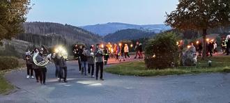 So begann am 02.10.2025 um 19.00 Uhr vom Standort der FFW Dröbischau/Egelsdorf aus, unter den Klängen der Blaskapelle des Musikvereins Oelze der Zug durchs Dorf zum Festplatz, wo ein großes Friedensfeuer angezündet wurde.