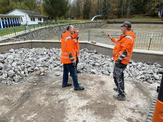 Dazu haben die Mitarbeiter des Bauhofs mittels Stemmhammer am Minibagger die undichte, alte Bodenplatte des Beckens entfernt.
