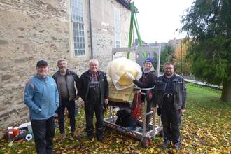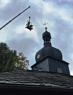 Doch es ging am Ende nochmal gut aus: Genau am Einweihungstag, dem 17. Oktober, gelang es, alles wieder mit einem großen Kran auf dem Kirchturm zu montieren.
