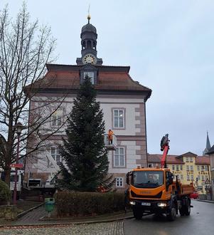 Wie in jedem Jahr kündigt ein großer Weihnachtsbaum vor dem Rathaus den Beginn der Adventszeit in Königsee an.