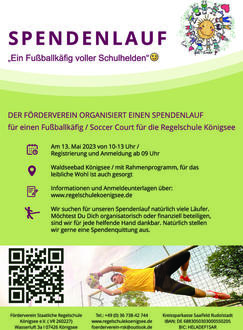 Am 13. Mai 2023 ist die Anmeldung zum Start und zur Registrierung ab 9 Uhr möglich. Eine Runde ist ca. 500m lang und wir freuen uns über 5€ pro gelaufene Runde. Natürlich kann auch ein Maximalbetrag auf der Sponsorenerklärung festgelegt werden. Unsere Schüler und Mitglieder des Fördervereines sind bereits auf Sponsorensuche unterwegs.
