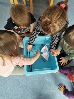 Zu Beginn unserer Projektwoche beschäftigten wir uns mit der Frage: "Welche Gegenstände können auf der Wasseroberfläche schwimmen?" Um dies herauszufinden, legten wir einige Materialen wie Buntstifte, Holzscheiben, Bastelscheren und Papierboote in ein Gefäß mit Wasser und beobachteten das Geschehen.