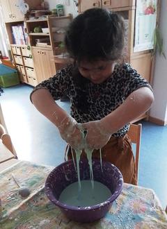 Unser Highlight war jedoch unser selbsthergestellter Zauberschleim aus Wasser und Speisestärke, welcher sich durch Druckeinwirkung verfestigt und anschließend von selbst zerfließt.