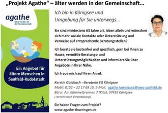 Die Agathe Beraterinnen im Landkreis Saalfeld-Rudolstadt sind seit Dezember 2024 am Start, um Senioren/innen ab 63 Jahre kostenfrei und spezifisch, gern auch zu Hause, über Hilfe - und Unterstützungsmöglichkeiten und über Angebote in Ihrer Nähe zu beraten und zu informieren.