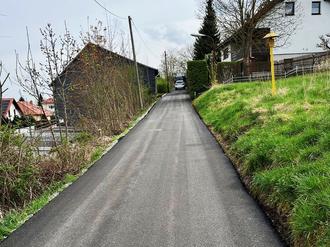 Nachdem im vergangenen Herbst die Verlegung von Glasfaserleitungen erfolgte, haben Anfang April die Arbeiten zum Ausbau der Fahrbahn begonnen. Der Erschließungsweg wurde auf ca. 250 m Länge mit einer Tragdeckschicht asphaltiert. Auf Grund der beengten Platzverhältnisse konnte allerdings größtenteils nur eine Wegbreite von 3,0 m -3,5 m Breite ausgebaut werden. Da es keinen Kanal zur Entwässerung gibt werden die Oberflächenwasser größtenteils über die Bankettbereiche abgeleitet. Mit den Arbeiten wurde die Firma Tiefbau Friedel aus Herschdorf beauftragt.