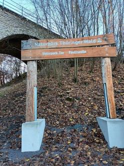Am Parkplatz Paulinzella entstand dafür ein Naturpark-Tor, welches Anfang und Ende des Rundwanderweges kennzeichnet und wie Herr Trefz in seinem OTZ-Beitrag treffend bemerkte, auch als Eingangstor für eine Wild-West-Ranch geeignet wäre. Ebenfalls auf dem Parkplatz sind eine Infohütte und eine Trockentoilette errichtet worden. Letztere war übrigens Anstoß des Projektes, denn wenn das Museum in Paulinzella nicht geöffnet hatte, verfügte der touristisch bekannte Ortsteil von Königsee über keine öffentliche Toilette. Dies führte oft zu Unmut bei Touristen und Gästen aber auch bei den Anwohnern des Parkplatzes, da dort sämtliche Ecken zur Toilette umfunktioniert wurden.