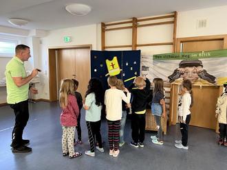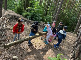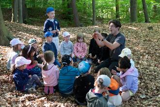 Weitere zwei Tage hatten sie Besuch von Giuseppe Palandra, auch Pino genannt. Die Kinder waren von Anfang an begeistert von seiner motivierenden und freundlichen Art, besonders auch weil sein Hund Bruno immer mit dabei war. Voller Freude hat er die Kinder auf eine spannende Reise durch den Wald mitgenommen. Es gab eine kleine Vorstellungsrunde und dann ein Begrüßungsspiel. Danach sollten die Kinder die Bäume fragen, wie alt sie eigentlich sind. Da diese aber leider nicht antworten können, hat Pino unseren Entdeckern gezeigt, dass das Alter der Bäume anhand ihrer Jahresringe ablesbar ist. Die Kinder suchten allerlei Naturmaterialien im Wald, um später gemeinsam den Erklärungen von Pino zu lauschen. Dann hatten die Kinder die spannende Aufgabe, aus den verschiedenen Dingen einen Baum zu legen (davor wurde geklärt, was alles zu einem Baum gehört). Auch ein Vogelmemory hat große Begeisterung bei den Kindern hervorgerufen. Am Ende konnten sich die Kids noch bei einem Fangspiel auspowern.