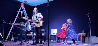 Doch nach der Zugabe, als alle dachten, sie müssen jetzt nach Hause gehen, kam ein Zuschauer und selber Mitglied in einer Band, Thomas Frischmuth, auf die Bühne, bedankte sich im Namen aller für das wunderschöne Konzert, erinnerte an die Zeiten als der Saal noch voll im Betrieb war, als er mit 14 sein musikalisches Debüt auf dieser Bühne hatte, als Petra und Hans ihre silberne Hochzeit dort feierten und dann rundete er den Abend mit dem Paulinzella-Lied, das auch vom Publikum mitgesungen wurde und im Hintergrund passend zum Objekt tanzten die Kinder.