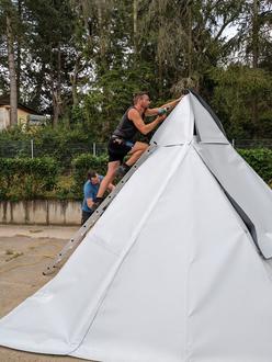 Das werden wir wohl in der nächsten Zeit noch öfter zu hören bekommen. Viele Tage konnten die Kinder des Kindergartens "Regenbogen" nur beim Bau des neuen Tipis im Garten zuschauen. Endlich war es soweit und es durfte bezogen werden. Viel Arbeit und Engagement steckt darin. Besonders bedanken möchten wir uns auch hier nochmal bei Herrn Driesel und Herrn Höll für ihren Einsatz und natürlich für das Sponsern des Holzes und der Plane. Auch unser Hausmeister Kalli hat für seinen Einsatz ein großes Dankeschön verdient. Die Kinder werden an diesem tollen Tipi noch lange Spaß haben und es nach ihren eigenen Vorstellungen gestalten und einrichten.
