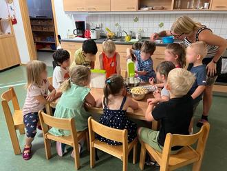 Auch im Kindergarten hat es lecker nach Kuchen geduftet. In der Gruppe der Hummeln wurde aus garteneigenen Äpfeln ein wohlschmeckender Apfelkuchen gebacken, den sich die Kinder dann zur Vesper haben schmecken lassen.